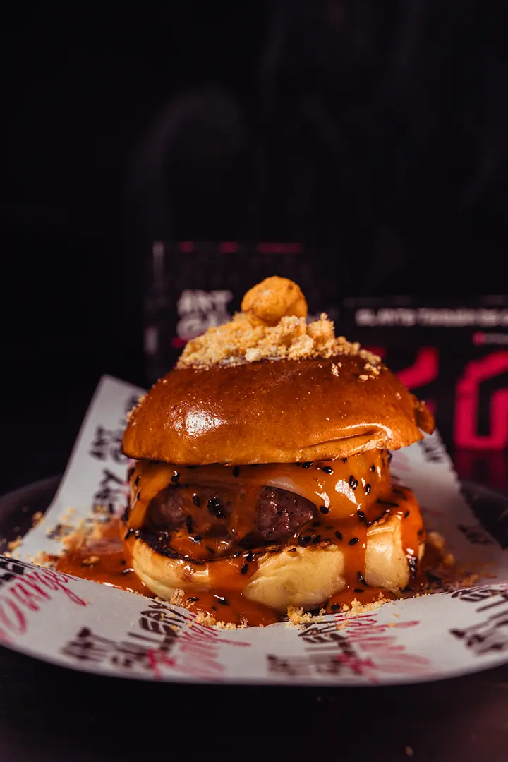 La más atrevida del menú. Carne de Chuletón madurado 180g, queso Edam, salsa Emmy casera, polvo de pelotazos.