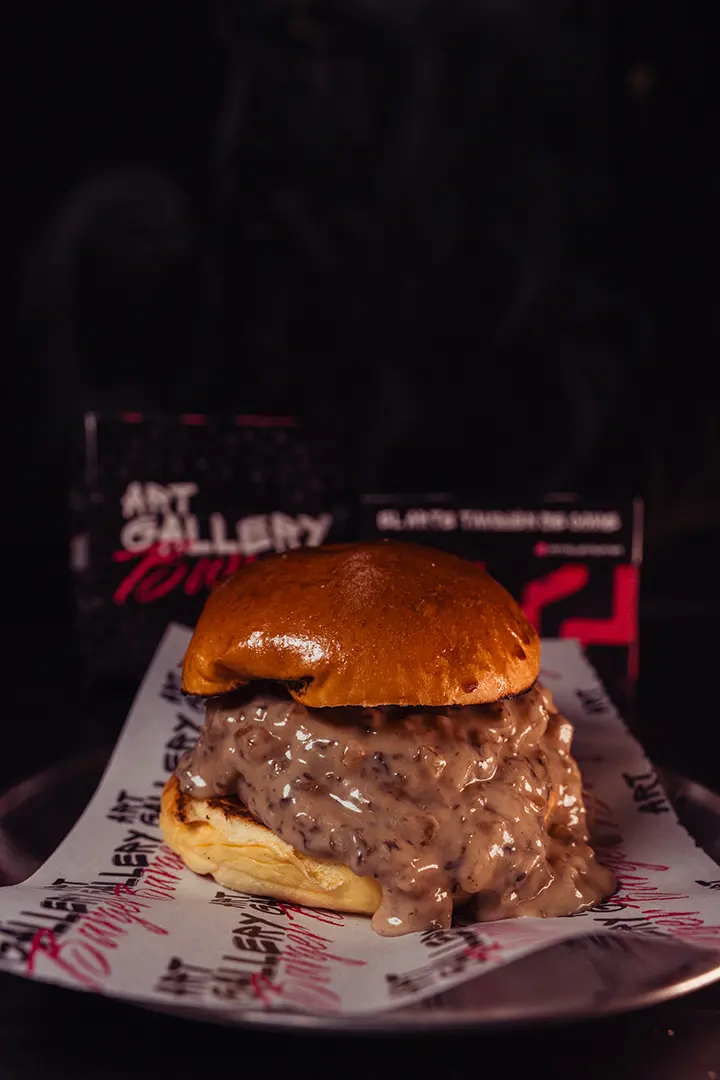 Pecado gourmet en cada bocado. Carne de Chuletón madurado 180g, queso Edam, bacon, cebolla caramelizada, salsa trufada.