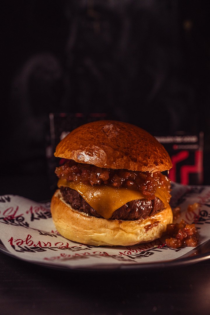Extra bacon, extra amor. Carne de Chuletón madurado 180g, queso cheddar, 2 tiras de bacon, mermelada de bacon.