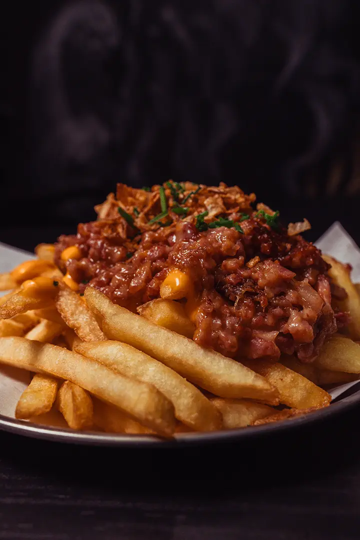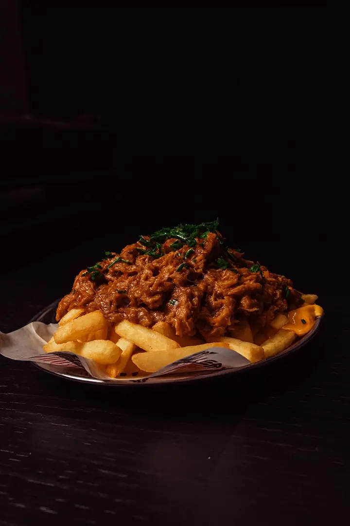 Patatas fritas acompañadas con queso cheddar y nuestro delicioso pulled pork.